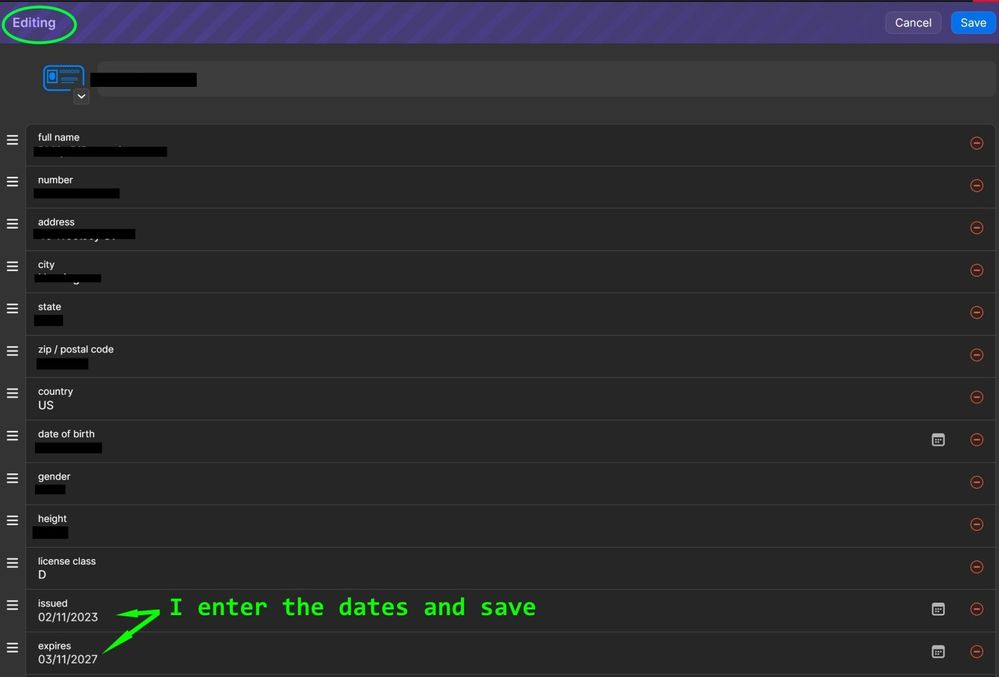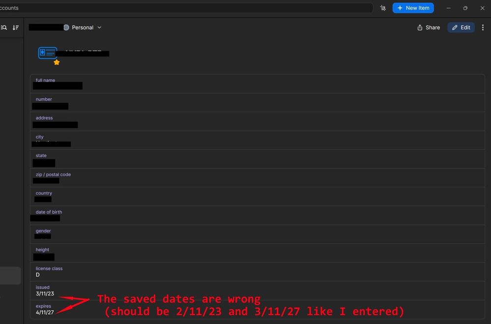 When editing my drivers license details, I enter the "issued" and "expires" dates and when I save it the dates magically change to one month too late?