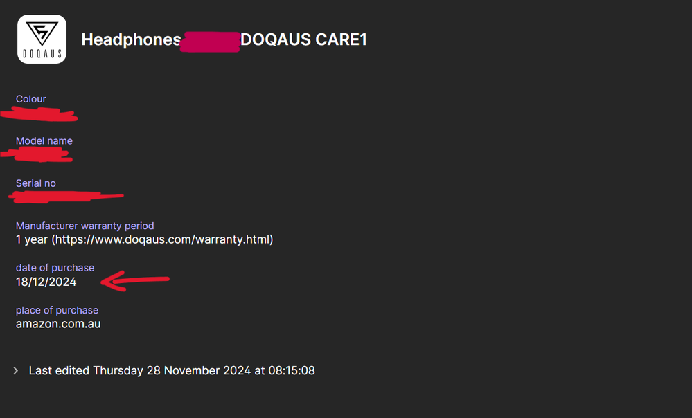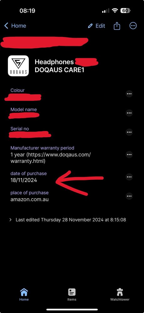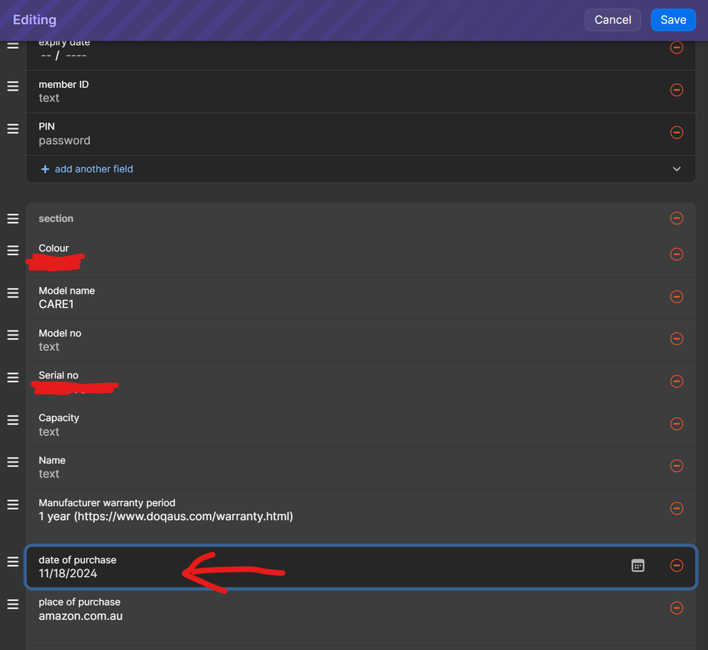 1 - Date is entered / amended in 1Password Windows - in this case to 18/11/24 (actually 11/18/24 as goes to mm/dd/yyyy for entry).