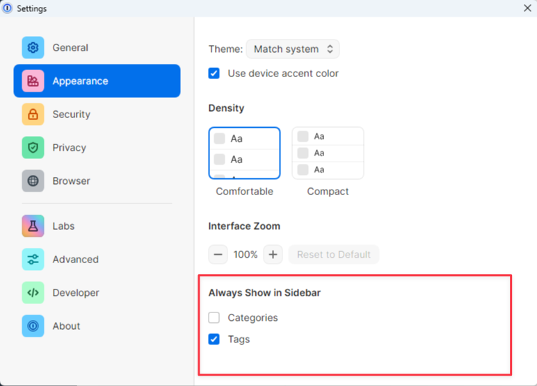 Thank you, Grey, but when I follow the directions under the "Use the sidebar in 1Password" link above, there is no "Always Show in Sidebar" option under Appearance, as it says there will be. Rather, Appearance has "Match System", "Dark" and "Light" as options. What else should I try?