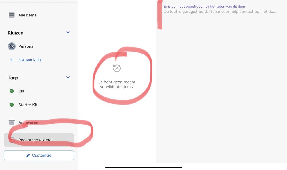 If you tap on any other tab on the sidebar like "Archiveren" then back on to "Recent verwijderd", the error message should disappear.