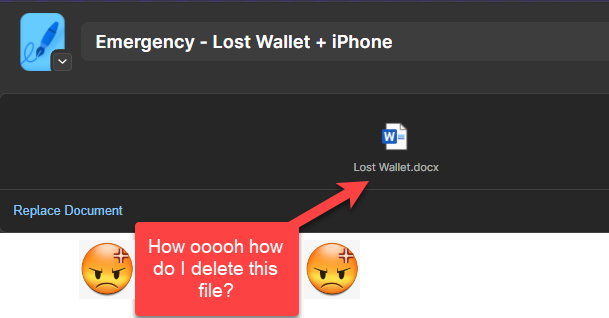 It's possible that in the future we could provide a way to convert a Document item to another kind of item with a File Attachment so that you wouldn't need to delete the whole item just to remove the referenced file. Let me know if that's something that would work for you so I can run it past our design and product teams.