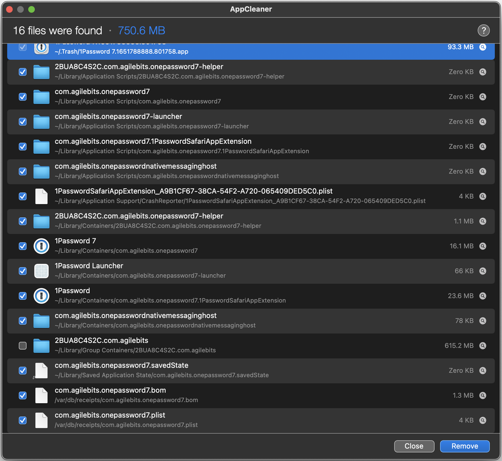 In general, I don't recommend using an app cleaner on 1Password's local files. I personally leave the older files alone since they don't cause any issue just resting where they are as long as the 1Password 7 app is no longer in your Mac's Applications folder.