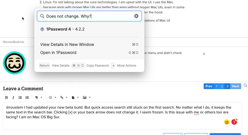 roustem 1P_Rob Even when I have selected a particular vault or collection in the main app, your quick access shows results from all vaults and I see all my repeated same items in the list. This is annoying. Can you fix the connection from what is the settings in the main app and what quick access behaves? Both are acting like different countries with their own rules. Plus the quick access needs a browse function. It also does not remain persistent after I select an item to view. I need to go back and view other items. How to do that? Don't copy mac spotlight search behaviour and implement it in your app. I don't like shortcuts and remembering them. I am a mouse pointer user. If the UI doesn't have a back arrow UI, then that function doesn't exist for me. Don't tell me to use the escape or back arrow button. You are a big failure on accessiblity. Don't screw mouse users.