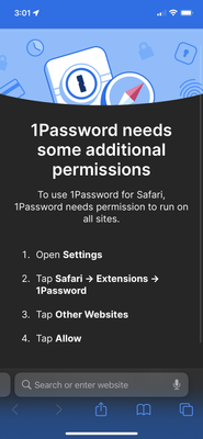 Despite enabling full permissions in safari, swiping back a page displays the 1PW instructions