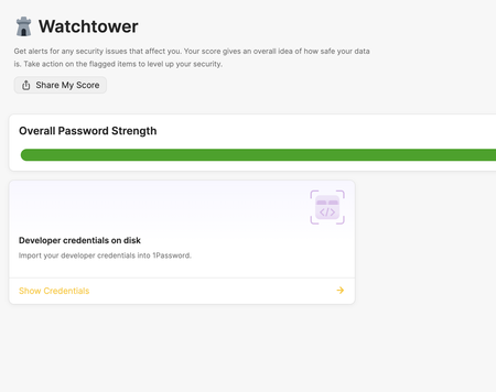 Thank you for reporting the issue. Our developers have a work item open to address an issue where the "Developer credentials on disk" card can't be dismissed in Watchtower and I've added your report there. I'm sorry for the inconvenience.