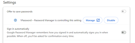 I wish to have passwords filled in by 1Password. I have attempted to turn off the auto fill feature in Chrome, but it continues to attempt to auto fill password fields(Often hiding the 1Password ent...