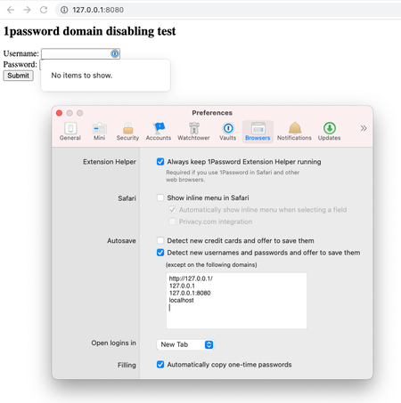 I have followed all of the previous posts about adding domains to the blacklist in 1Password > Preferences > Browser > Autosave > (except on the following domains) so that 1Password doesn't sho...