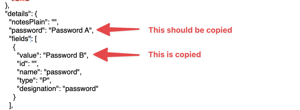 Thank you for following up and for reporting the issue. I've imported the item JSON that you provided and, using your item, I was able to reproduce the issue on my end as well. The issue can be reproduced even if all of the entries in "password history" are removed from the item so my hunch is that the value of the "Auto-Saved Web Details" password field is being copied to the clipboard because the item's JSON is malformed in some way: