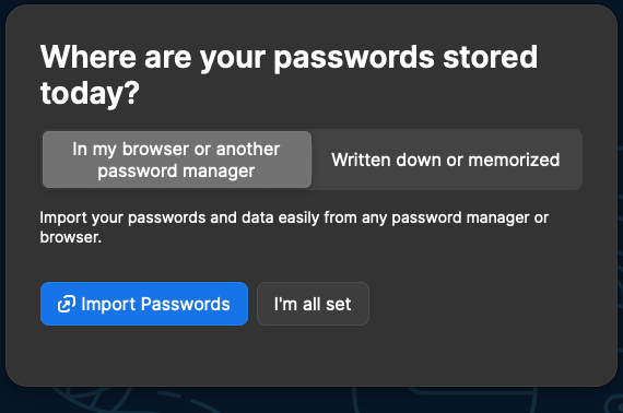 When I was updating my Safari 1Password Extension to 2.10.0 today, it asked if I wanted to import my passwords. What do I do? I have a 1Password subscription for Mac(a membership). When I log in to 1Password, I usually do so through the app on my dock. Then I navigate to my websites using 1Password in Safari with the little icon on the toolbar. I'm not sure what it means by importing passwords to Safari. My passwords are all in the 1Password app and in Safari via the little icon in Safari. So, every time when I have a 1Pass update in the App Store, it always asks if I want to import my passwords. My question is simply have I already done that? I'm confused. Sorry!