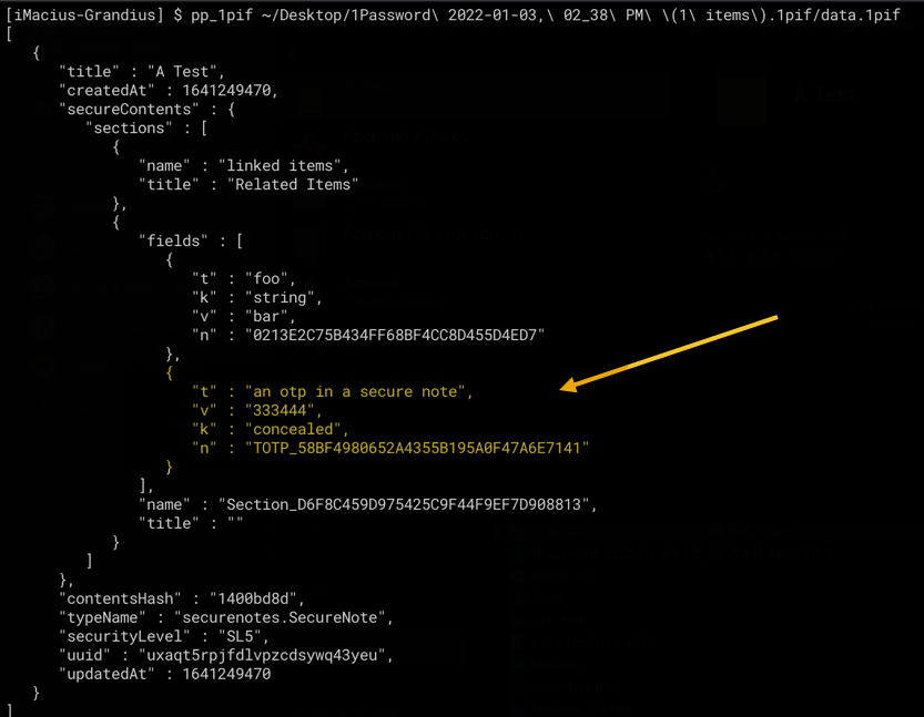 TOTP_entries inside of each item's "fields" list. The kind (k value) is"concealed" and the value (v value) is the original TOTP seed code you entered.