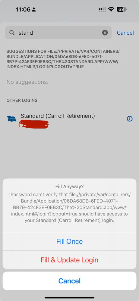 When using TheStandard app, it does not find my saved credentials. I have to search for it. It prompts me if I want to save and update the login but that has no effect.