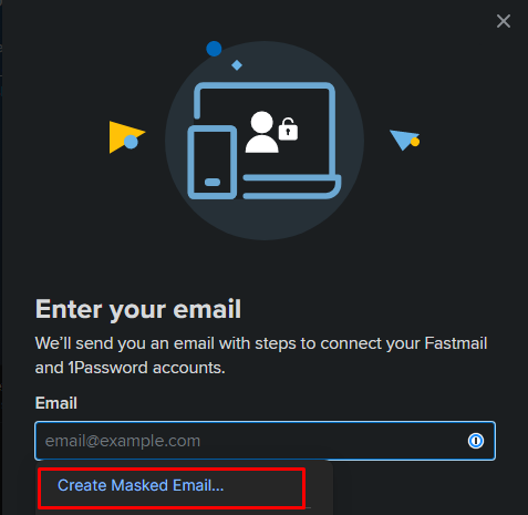 On some sites it works without any problems and the Create Masked Email option appears in the email field but on some it simply doesn't appear even if it's an email field. My guess is that 1Password doesn't see that specific field as an email field but in this case it would be nice to have an option that allows you to manually select to Create a Masked Email for that specific entry.