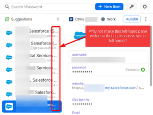 It would be helpful to increase the width of the left-hand pane on the 1Password selection drop-down in Microsoft Edge. Long entry names get cut off, and in some cases users have large numbers of si...