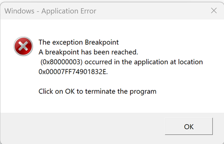 Whenever I try to install or open 1password, I get an error saying that Exception breakpoint has been reached (0x80000003). This occurs with the old installed version, with a freshly downloaded inst...