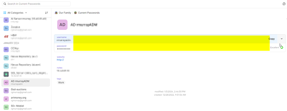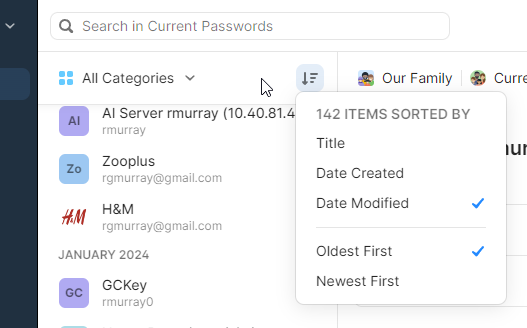 The search capability does not work very well in the new interface. In the original view, doing a search of a word in all vaults of a word bring up my 3 entries across all the vaults (private and shared) when I press enter. In the new interface, they are found and listed in the drop down list that appears but when I press enter, I only see the first entry, not all three listed.
