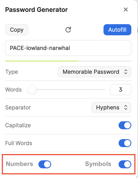 3 years agoTo reiterate Kirk's comment/request about adding numbers and symbols to the memorable-password option, I think that it would be a great add-on. Right now it's inconsistent that you can choose "random" and then toggle those characters for insertion, but you can't do the same thing for memorable-passwords. I think that one of the most common reasons that people choose this option is so that passwords are easier to remember briefly, much like a phone number is easier to copy when represented as 789-867-5309, when you have to manually type them (e.g. websites/apps that don't allow pasting into password boxes and won't autofill). By just replacing the delimiter with a random character/number you've simply recreated the "random" password type with numbers and symbols selected. Thus we end up with "trog!FEEH6on?wral0oun" when we wanted "tr!g-FEEH-0n-wral-6un" and just end up manually editing memorable passwords to add required elements instead. Thanks!