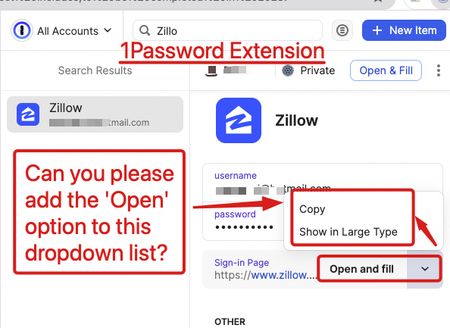 It would be helpful if the 1Password extension 'Open and fill' option for webpage URLs would be consistent with the other versions (i.e. macOS & IOS apps) and include the 'Open' option in the list of...