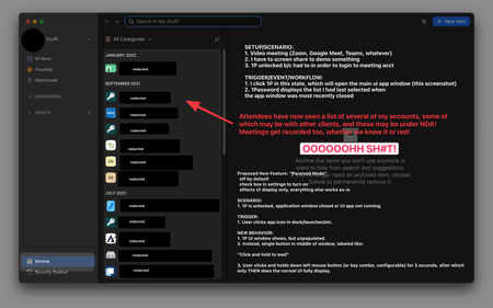 4 years agoThis is an interesting idea, @jahio, thanks for the write-up. There are a couple good suggestions from others here for how to avoid mishaps with the way the app works today. I think of it kinda like desktop icons, too; it's a good idea to remove anything sensitive there before a call starts. I personally use collections a lot for this like @chris55 mentioned. Here are a couple more ideas: