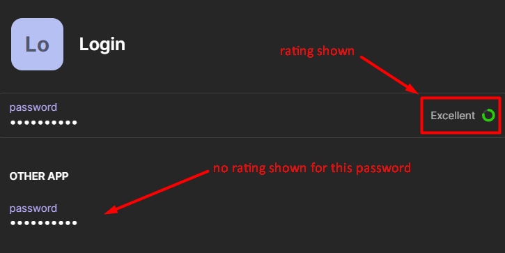I'd like to suggest to show password ratings for all 'password' fields. Currently if I make an item any additional passwords are shown without password rating:
