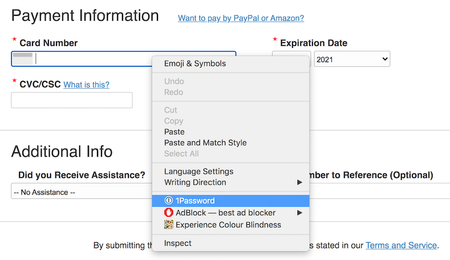 I'm checking out on a website. I right-click on the credit card field and select 1password in the popup menu.