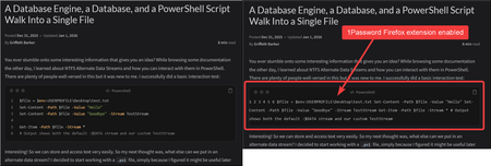 The 1Password extension for Firefox seems to mess up the text formatting of some code blocks. One example is to go to https://griff.systems/posts/self-contained-sqlite-database-in-powershell-script/ ...
