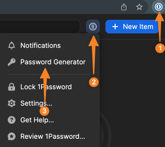 There are a couple options for generating a password with 1Password 8, the first is using the password generator built into the 1Password browser extension: