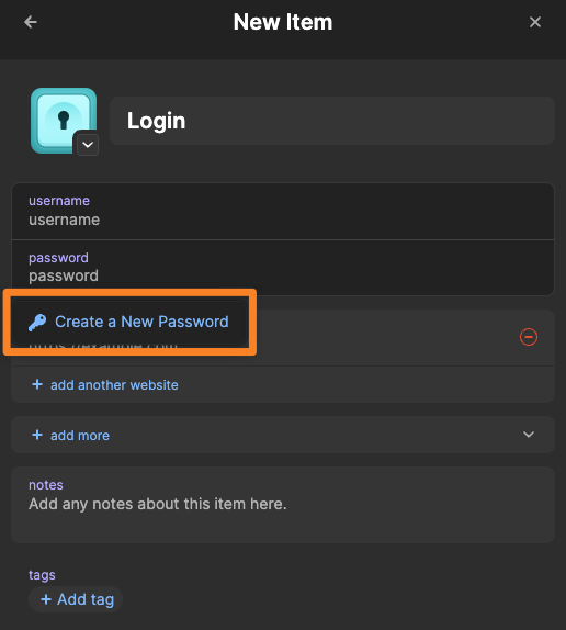 + New Itembutton in the top right of the 1Password 8 Mac app and selectLoginorPassword. Clicking the password field on the new item will give you to option to generate a password:All that said, I understand there are some scenarios where it may be useful to have a password generator built into Quick Access, and tracking for this feature is ongoing. I've added a vote on behalf of both of you and appreciate you taking the time to tell us it's important to you.