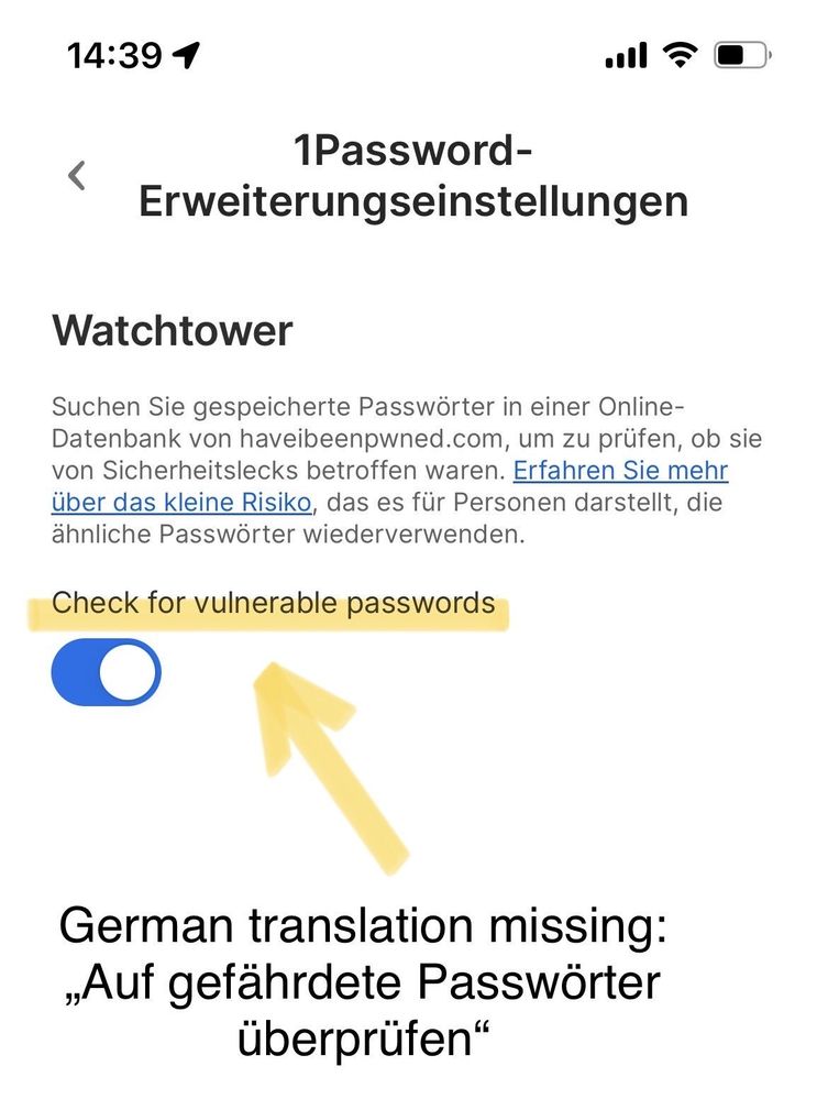 In the 1Password settings of the browser extension under the sub-item Watchtower, a text label is not translated into German: