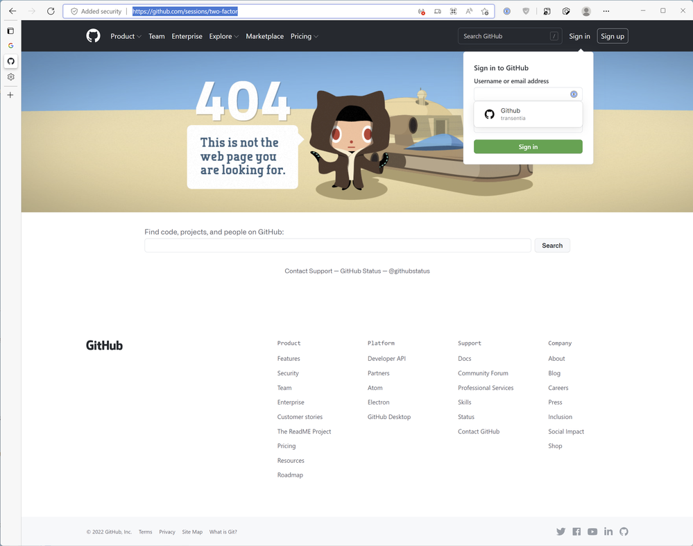 1p supplies username/password. Hit "Sign in", button title changes to "Signing in...", then browser arrives at https://github.com/sessions/two-factor. See image.