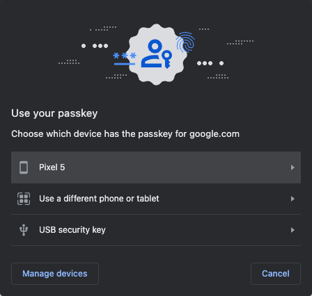 When I try to log into my Google account using a passkey, I get a "Choose which device has the passkey for google.com" dialogue box: