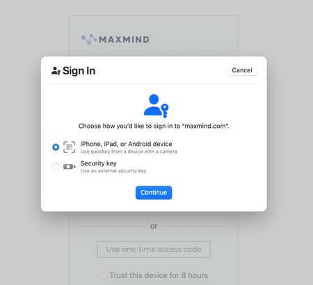 I've successfully generated a passkey to use for 2FA on MaxMind.com (instead of getting emailed a code which I find annoying). In chrome, the 1P extension recognizes the Passkey flow and pops up, but...