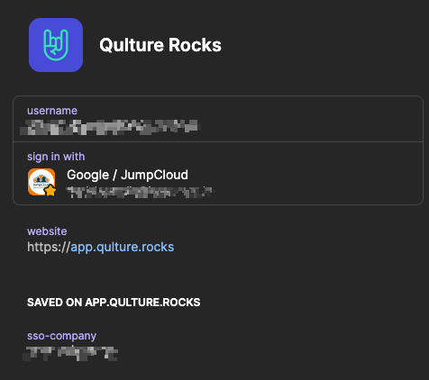 How can 1Password help me with this login flow, at least autofilling the "Company name" SSO identifier in the Qulture Rocks login page? The corresponding input field has `id=sso-company`, which is saved in 1Password (see screenshot).