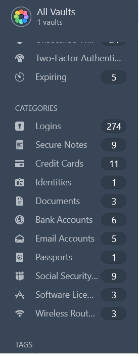 There is a screenshot of my categories. Not sure why I don't have a passwords category, but I don't.Former Member