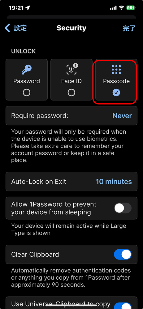 From here, you will be able to select whether you can unlock 1Password on your iPhone with Face ID, account password, or your device passcode. Your device passcode will probably be the best option so you don't need to continue typing in your long account password whilst waiting to get your TrueDepth camera system fixed :)