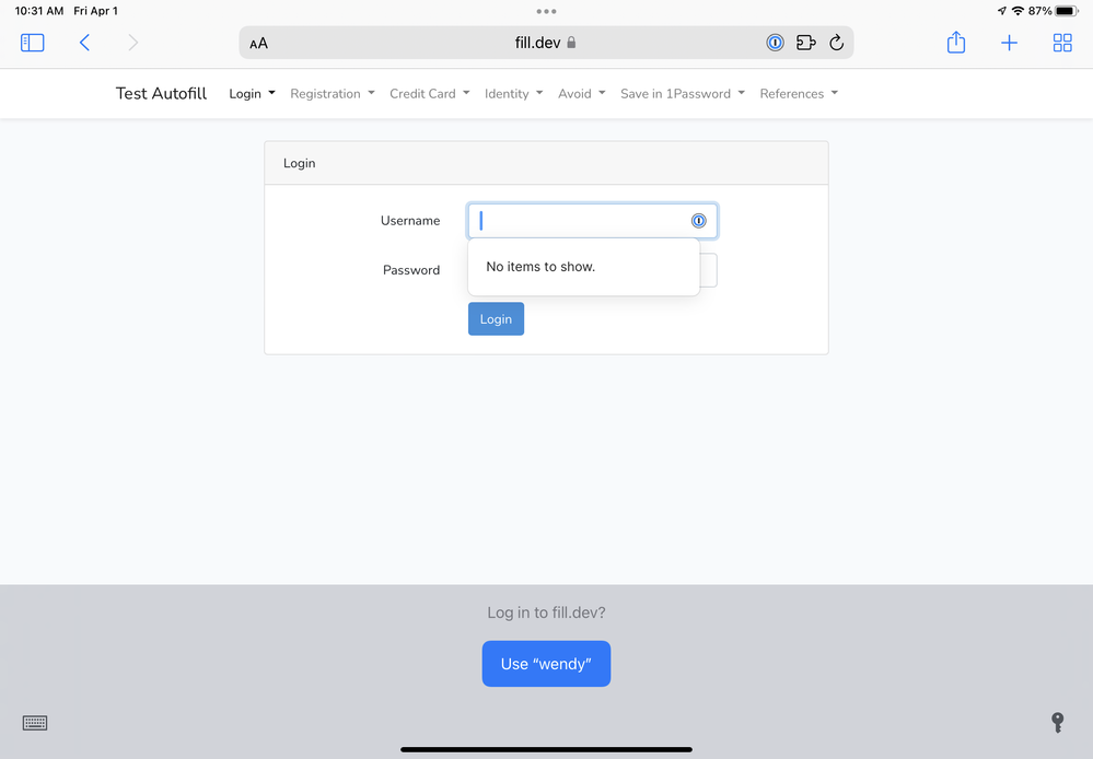 After setting everything up, navigate to a site you'd like to import into 1Password on your device. Tap the username field for the website. You should see a dropdown below the username, as well as the "Log in to example.com" pop-up.