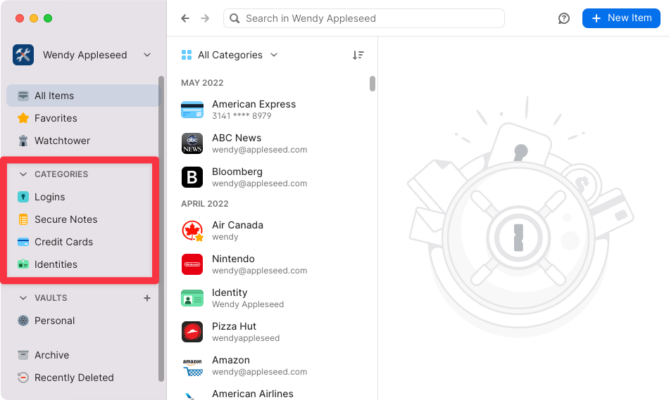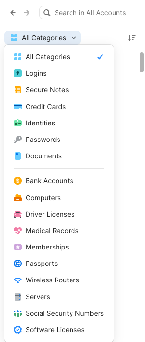 That'll be more like what you'd have seen in 1Password 7. You can also use the drop-down menu just below Search to only show a single category at a time: