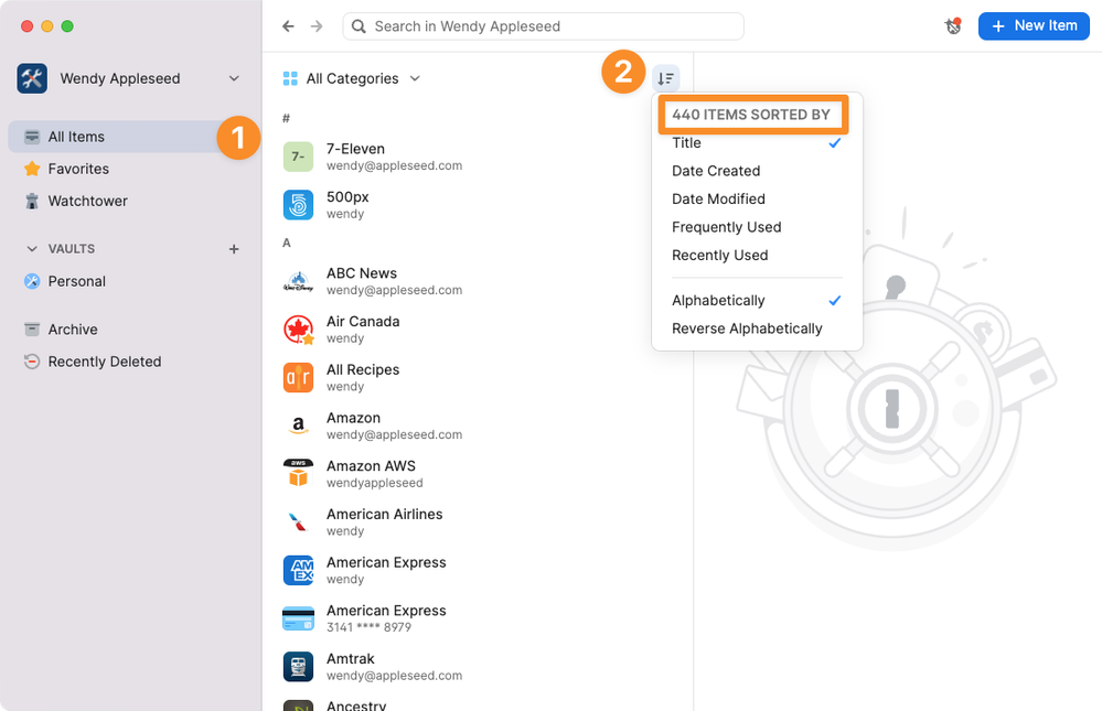 You can find the total number of items in 1Password by clicking the Sort button at the top of All Items, like this: