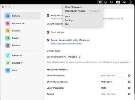 I have removed the shortcut (via the ⓧ button) and recorded a different one, but 1P8 ignored my setting. Worse, now I cannot get any shortcut to work, even the old one (shift-cmd-space).