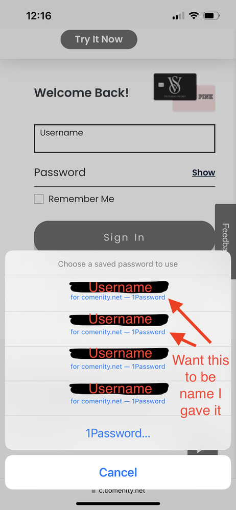The problem I have is that I have a couple of store cards for different merchants that are all issued by Comenity. Because of how they do their web portals, all of the logins have comenity as their top domain, but the trailing URL detail is card specific. On my Mac, I can differentiate between each login by the name I have given it, but on iOS, it just shows the website, meaning I can't figure out which login to use unless I actually go into 1P and then select the correct login. Same thing happens on lots of food ordering websites since they tend to use the same platforms.