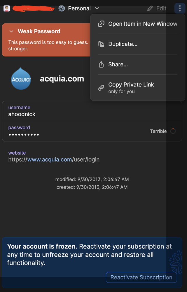 For example I have an item and password for Acquia.com. My account there does not exist anymore so I would like to delete it. First of all, I cannot edit it because there is a message at the bottom telling me: Your account is frozen. Reactivate your subscription at anytime to unfreeze your account and restore all functionality. When I reactivate it, it takes me to my online account informing me that my account is active. When I refresh the software I still get the error message my account is frozen