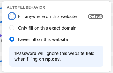 I have disabled 1password on my local development domain, yet it remains active. There does not appear to be an option to simply disable 1password for an entire domain or subdomain. Feature request:...