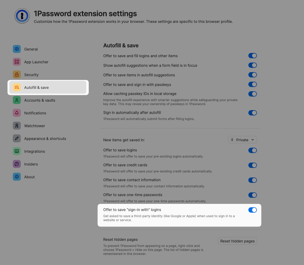 Hey rogierl​! If you right-click the 1Password Browser Extension, go to Settings > Autofill & save and un-check the "Offer to save 'sign-in with' logins" (shown below) you won't see this pop-up asking you to save those anymore. 🙂
