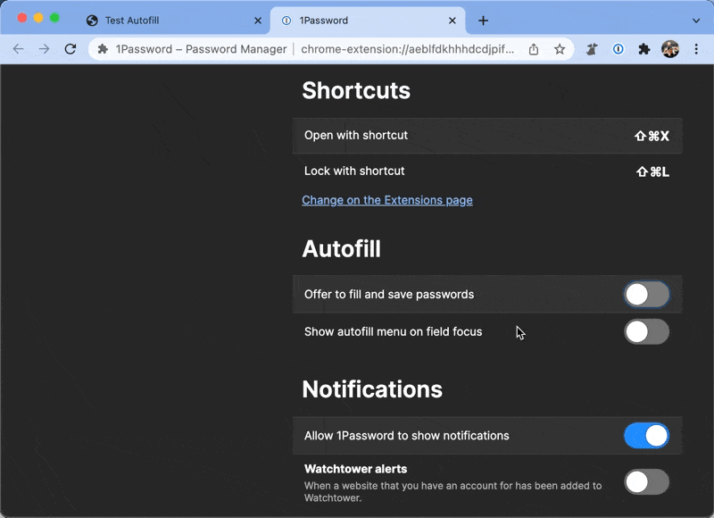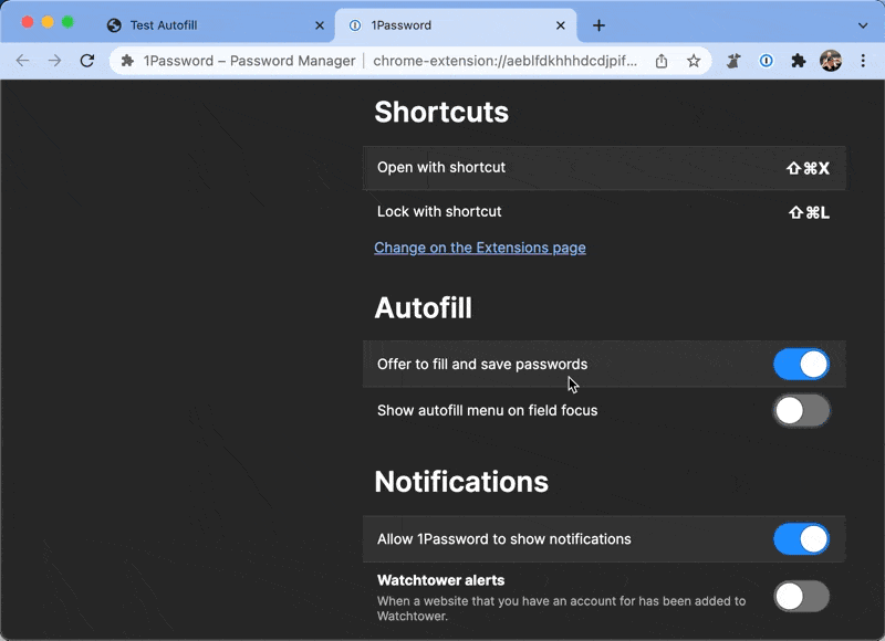 -Suppose the above is not what you are looking for. In that case, my suggestion is to activate the "Offer to fill and save passwords", but deselect the "Show autofill menu on field focus". It will effectively hide the inline menu. Then, when you want to see it, you can click the blue 1Password icon in the field to view suggestions. In addition, you can quickly close the suggestions by clicking the esc key. As shown below: