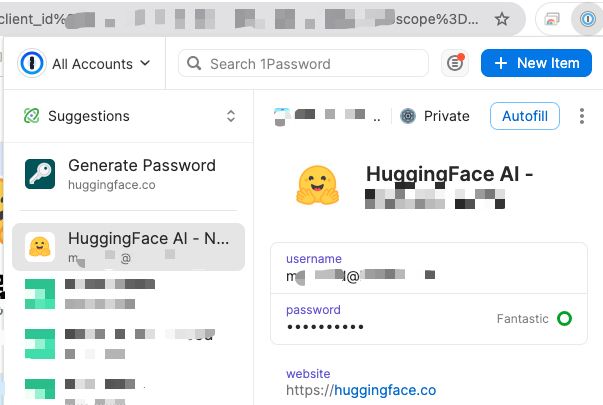 I want to register as a new user to huggingface.co , so I create a 1Password entry a priori with the credentials I want to use (as I mentioned above).
