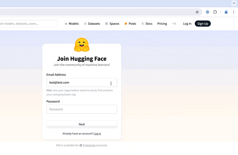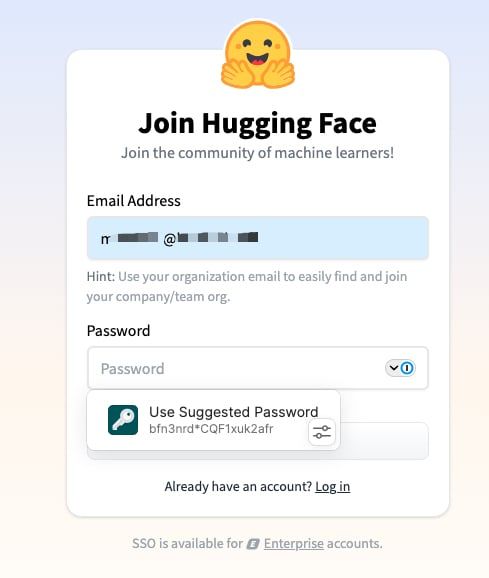 For example, I just discovered HuggingFace.co and I wanted to set up a new account. So, I followed the flow I outlined above and created a 1Password entry a priori and I want to use that entry for establishing the login credentials when prompted for it during the registration screen shown here: