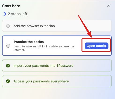 Today, I noticed a message in my 1Password extension 'Start up' saying that I had "2 Steps Left" (which I was surprised since I consider myself a longtime user and thought I had everything set up).