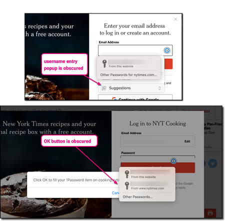 I find it almost impossible to use 1Password with macOS. When I try to login to a website, the 1Password "popups" (not sure what else to call them) are obscured by another popup. How can I configure...