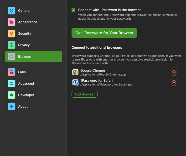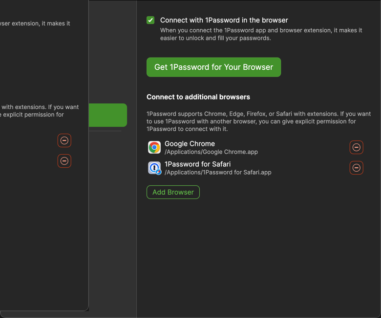 Regarding the other screenshots that you posted, I see that you've added "Google Chrome" and "1Password for Safari" to the Connect to additional browsers section. This is a section that allows you to use unsupported browsers with 1Password. Google Chrome is already supported and 1Password for Safari is our browser extension for Safari, not a browser itself. You can remove both entries from this screen since adding them here doesn't do anything.