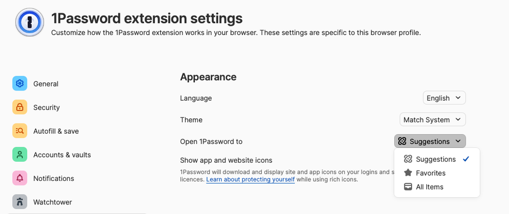 Please help me to get rid of 1PW's very annoying "Suggestions" or "Favorites" when opening 1PW window in any browser. These options ALWAYS get it WRONG and I need to fiddle with the menu to get "All items".