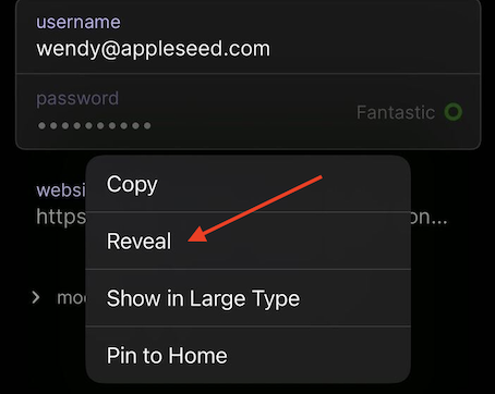 To reveal a password in the 1Password 8 for iOS app, long press on the password field. In the menu that appears, select "Reveal".